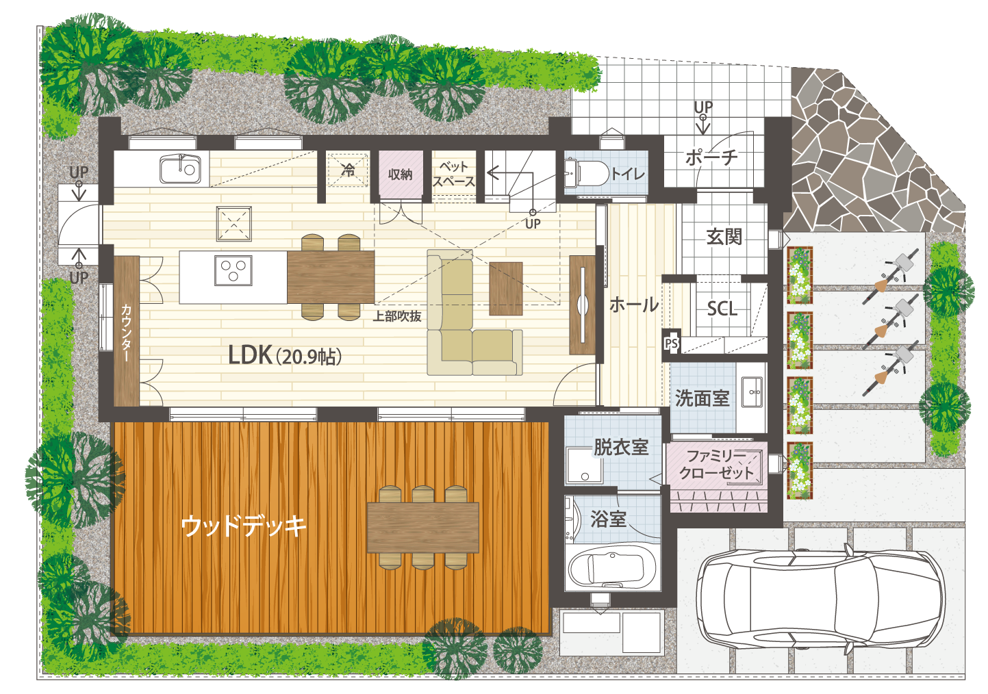 閑静なエリアに建つモデルハウスは、高い断熱性能を誇る住み心地に優れた住まい。解放感と快適性を兼ね備え、最高水準の断熱性能を誇ります。リビングと連続したウッドデッキや、バルコニーなどのアウトドア空間も充実しており、風と光を感じる健やかな住まいです。エアフロ―システムを搭載し、家全体が快適。9.0kWの太陽光パネルを採用し家計と地球にやさしい住まいです。