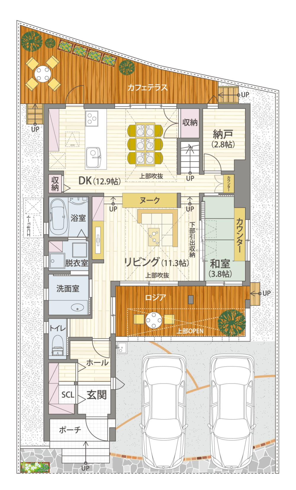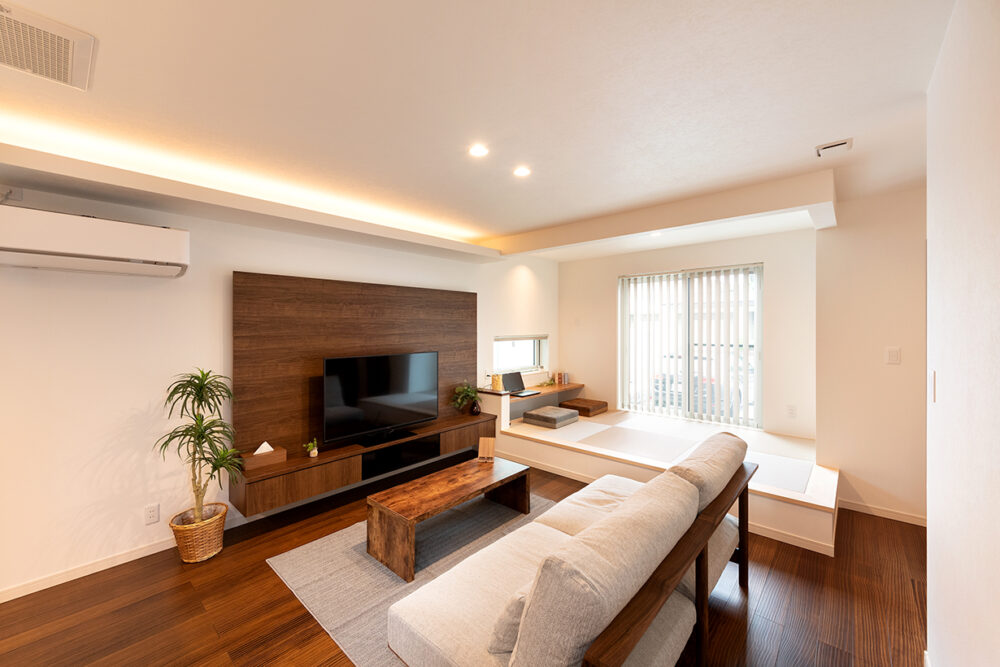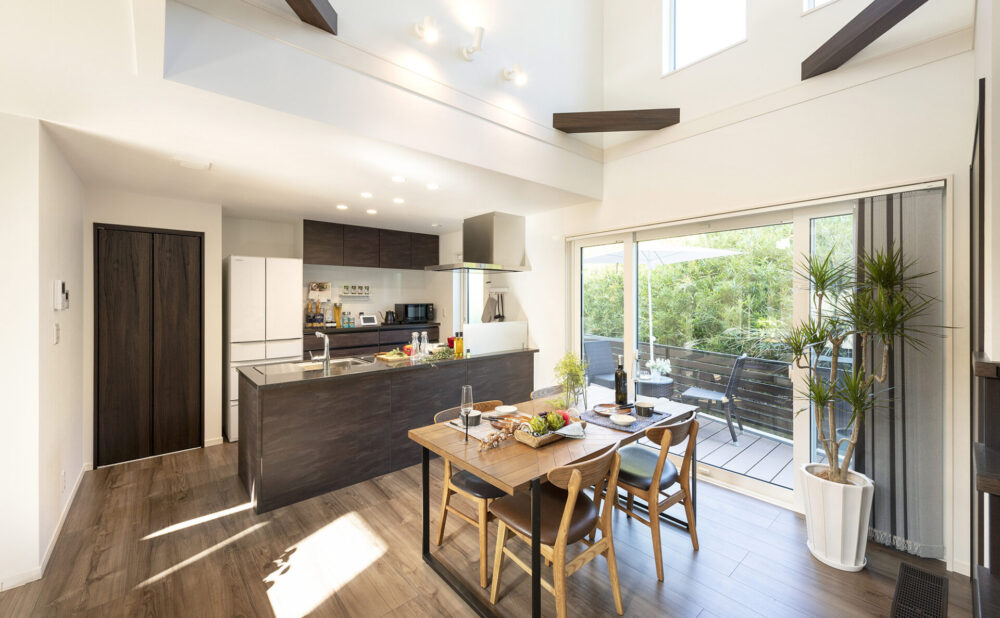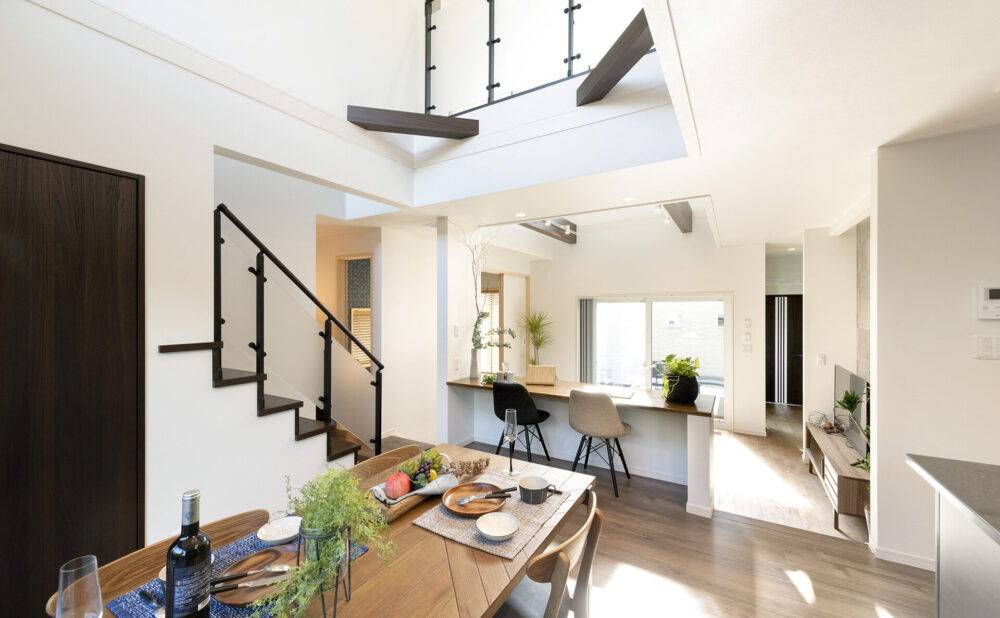 - スキップフロアでつながるリビング、ダイニング、和室、ロジア、カフェテラスの一室空間化