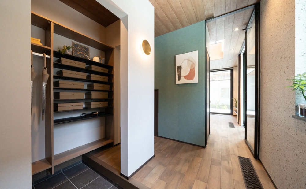 リモコンキーを持っていれば、ドアに近づくだけで施錠・解錠が可能なYKK APのポケットキーを採用。荷物で手がふさがっていてもスムーズに出入りでき、防犯性と利便性を兼ね備えた安心の玄関です。
