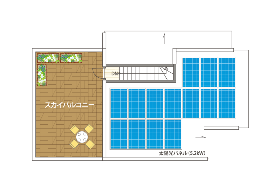 5.25kWの太陽光パネルを搭載。日々の生活エネルギーを創出。高い断熱性能と組み合わせることで、カーボンニュートラルな暮らしを実現します。