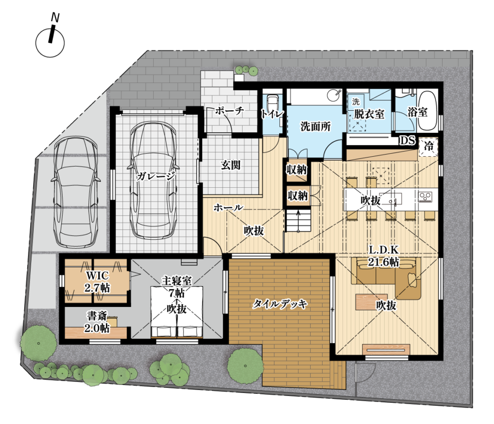 - デザイン性と機能性を兼ね備えたインナーガレージ。雨の日も濡れずに室内へアクセス